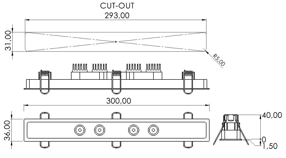 A contemporary minimal frame design, allowing an easy and fast springs mounting and maintenance. It is a 4 modules recessed fixed downlight for interior. High quality of light performance .A perfect luminaire for luxury areas, it enhances interior details and style.